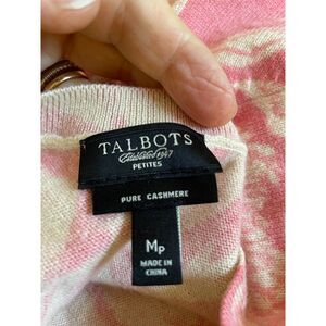 Talbots pink cashmere cardigan sweater medium petite. Sweet little cardigan in rose pink and cream super soft pure cashmere. This sweater has some minor moth damage near the collar on the back right near the shoulder seam, and one moth hole in the front right-hand side above the bust (sort of armpit level). I have mended these. This cute sweater still has lots of life left! In good used condition, non-smoking home.