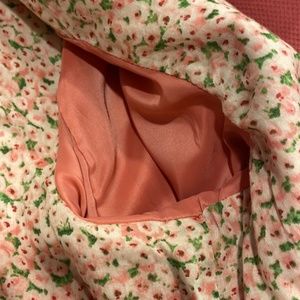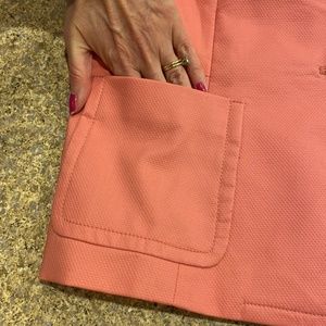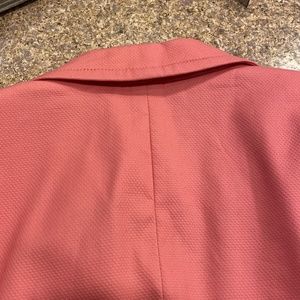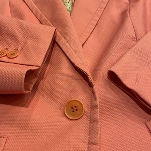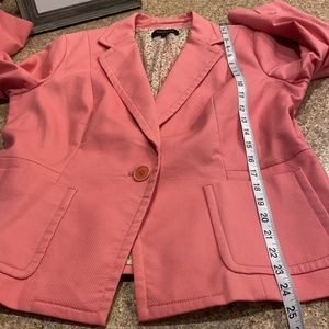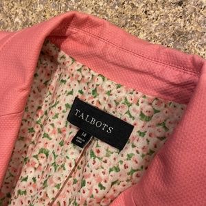 Talbots Pink Floral Lined Blazer Jacket 14. This is a really pretty blazer that is in gently used condition. There is SOME FADING where the collar unfolds. I feel it’s not very noticeable (but you may feel differently) since the collar is normally folded over and I didn’t notice it until I unfolded it for pictures. I took a picture of it. Measurements are approximate and colors may be off because of lighting. I feel some of the pictures make it appear more orange toned than it is. I consider it pink but everyone sees colors differently. There may be other minor imperfections since this isn’t new.