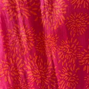 This pullover vibrant pink and orange tunic top is by Talbots. It features 3/4 sleeves with slits at the sleeve ends and at the bottom hem of the top. This would also make an excellent swimsuit coverup. Nice condition and a women’s size large.