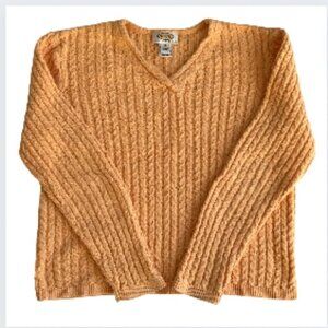 Add a pop of color to your wardrobe with this lovely pre-owned Talbots cardigan in a women's size large. The vibrant, allover paisley and floral pattern in shades of pink, coral, and yellow on an off-white background makes this a standout piece. It features a classic button-up front, long sleeves, and a soft knit construction. This versatile cardigan is perfect for layering over a simple top and pairs well with jeans for a casual look or with slacks for a business-casual outfit. In excellent pre-owned condition.