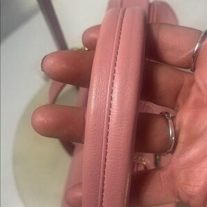 Stylish pink leather satchel with top handle. Features a secure clasp and detachable crossbody strap. Interior has one side zip pocket and two open side pockets. Gently used in good condition. Please view all photos for further description. Has some scrapes by the turn lock and light rubbing on the corners.