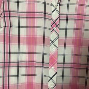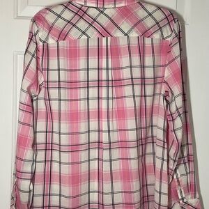 This is a lovely pink in this plaid button down shirt from Talbots. Misses size Large. Length is approx 27 inches and sleeves approx 24 inches. Chest is approx 20.5 inches.