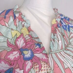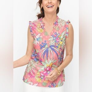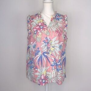 Talbots Pink Tropical Floral Print Ruffle Trim Sleeveless Blouse. Size Large
