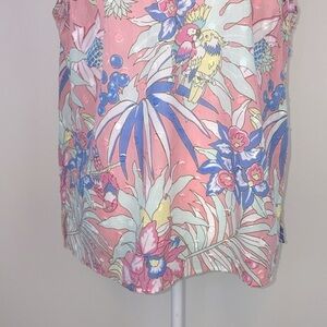 Talbots pink tropical floral print ruffle trim sleeveless blouse. Size large. In good preowned condition. No stains or holes. Cotton versatile tank with beautiful floral fauna print. Pullover. Split neck. Straight hem. Ruffles around neck and sleeves. Armpit to pit measures 20 inches. Top of shoulder down 25 inches. Comes from a smoke free home.