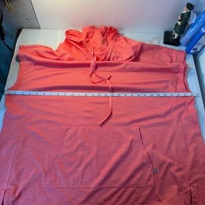 Vibrant pink tunic with a hood. Features a front pocket and short sleeves. Perfect for casual wear.