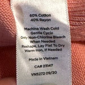 This Talbots cardigan showcases a delightful blend of pink and orange hues, crafted in a fine knit texture for a sophisticated look. Its classic button-front design and crew neckline offer timeless elegance, making it a versatile addition to any wardrobe. Small snag on back pictured