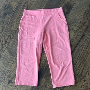 The best material!! Just taken off hanger, so cute in person. Pockets, comfy elastic waist band. Can be casual or dressed up. Cute color for spring!