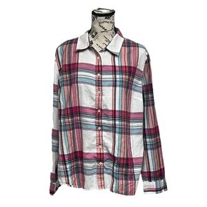 This Talbots plaid button-down shirt brings timeless preppy style with a relaxed, coastal twist. Featuring a mix of pink, teal, and white stripes, this soft cotton shirt is perfect for everyday wear or casual weekends by the water. Its lightweight fabric and easy silhouette make it ideal for layering over tanks or tying at the waist for a laid-back fisherman-inspired vibe. A classic piece that blends anglercore, coastal, and preppy aesthetics effortlessly.
