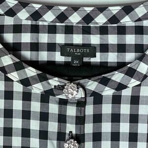 Talbots Plus 2X Black White Gingham Stretch Cotton Blouse w/ Rhinestone Buttons
