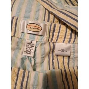 These Talbots Plus Capri Pants in women's size 14 feature a seersucker fabric with a pinstripe design, giving them a nautical and vintage look. The pants have a high-rise waist with a zip, hook and loop and button closure, and cuffed legs for a cropped style. They include various accents such as slash pockets in the front, belt loops, and two back pocket. Made of comfortable cotton material, these Capri pants are perfect for casual or travel occasions in all seasons. The multicolor striped pattern and beachy theme add a stylish touch to these classic and versatile pants. Blue yellow green and white.
