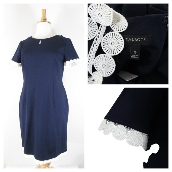 Beautiful Talbots women's plus size dark navy short sleeve sheath dress new with tags. Originally $149. Beautiful embroidered lace circle trim detail on sleeves and hem. Rayon nylon blend. Size 16. Perfect for any occasion!