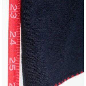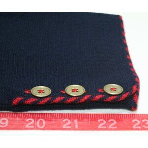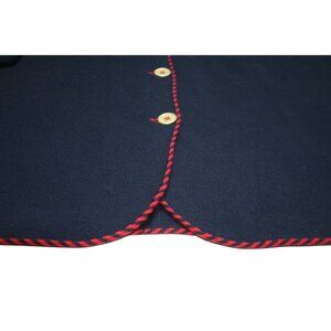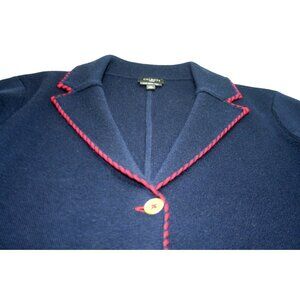 Talbots merino wool sweater-blazer blending structure and comfort. Navy with red whipstitch trim and gold-tone buttons. Perfect for preppy, office casual, and classic wardrobes. Elegant and versatile layering piece.