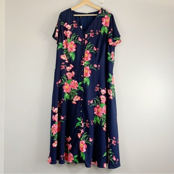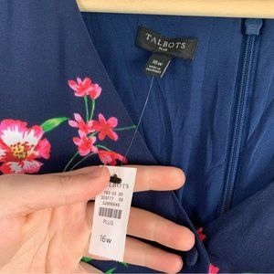 Talbots Plus Women Blue Pink Floral Flutter Sleeve Maxi Dress Fit Flare 16 W