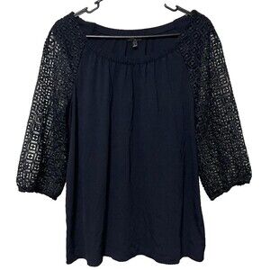 Talbots Plus Women's Size X Navy Blue Blouse Crochet Gothic Laced 3/4 Sleeves