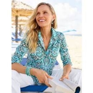 Talbots Plus Fanciful Paisley Button Front Top Blouse Sz 3X Teal