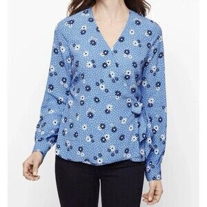 Elevate your wardrobe with this beautiful Talbots blouse featuring a dainty floral pattern and long sleeves. The faux wrap style and snap closure add a touch of sophistication to this casual yet versatile piece. Perfect for business or casual occasions, this blue top is made of lightweight viscose material, making it suitable for summer, fall, and spring seasons.