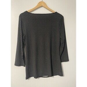 This is a Talbots tunic top shirt in size M. It is made of a stretchy polyester/spandex knit fabric in black. The top features ruched detailing and is designed in a tunic style, suitable for women's business or casual wear.