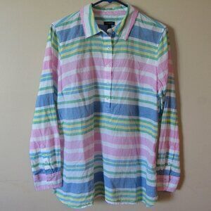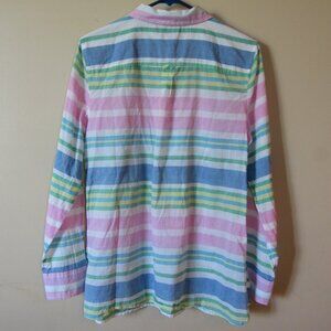 Talbots Popover Shirt sz Large Long Sleeve White Pink Blue Green Stripe Cotton. Very lightweight cotton. Button detail on each side.