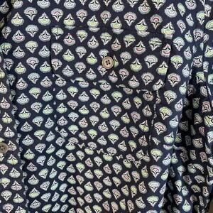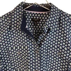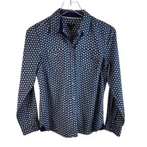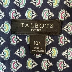 Talbots Printed Shirt With Roll-Tab Sleeves. Size 10 Petite. Navy with colorful print design in 100% cotton. Front button-down pockets & long sleeves with roll-tab option. Excellent preowned condition.