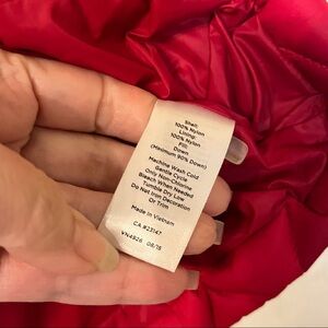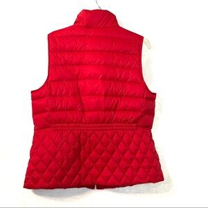 This bold red puffer vest from Talbots combines functional warmth with timeless style. The body features horizontal and diamond-quilted stitching, filled with a minimum of 90% down for insulation without bulk. Crafted from 100% nylon shell and lining, it includes gold-tone zippered front pockets and a full zip front with a stand collar. Elastic detail in the back adds shape. Size Large.