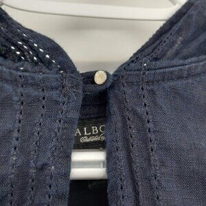 Talbots Pure Irish Linen Navy Blue Hooded Shirt Top Keyhole Split Neck Eyelet Relaxed Fit Loose Long Sleeve Pockets Lightweight Breathable Pull On Women's