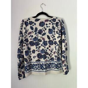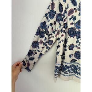 Round neckline. Smocked sleeves. Beautiful blue, purple, pink color scheme.