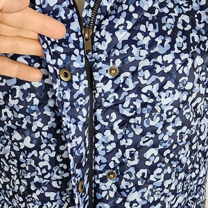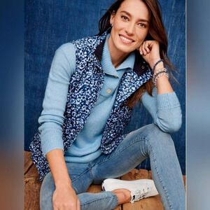 New with tags, Talbots abstract leopard print in shades of blue, diamond quilted vest, size large petites.