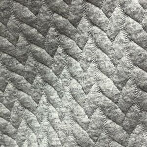 Quilted gray pullover has silver metallic thread detail, two side vent zippers, three snaps at the cuffs.