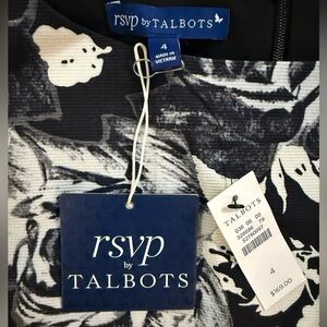 This classic RSVP by Talbots dress combines timeless elegance with a flattering fit-and-flare silhouette. The black base with a chic white floral print makes it perfect for weddings, garden parties, or any special occasion.