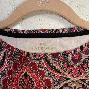 Pretty long sleeve top from Talbots. Intricate pattern design in reds, burgundy, tan and black. One of those nice basic styles that would go with anything. Crew neck style. 100% Pima Cotton. Gently used but in very good condition. No rips or stains. Size Large-Petite.