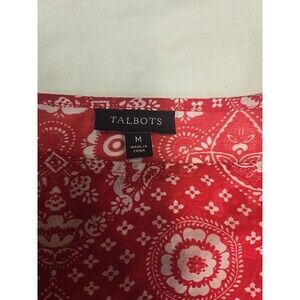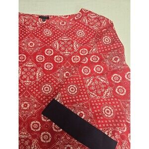 Talbots women's size medium red and white flower pattern with navy blue trim. Tunic length, 3/4 flowly sleeves, 100% polyester.