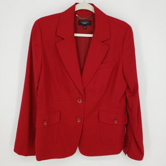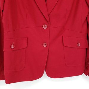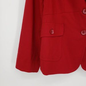 Chic red blazer with button closure. Features notched lapels and front pockets. Perfect for professional or casual wear.