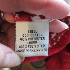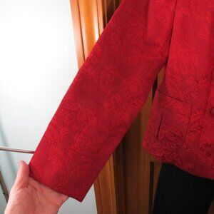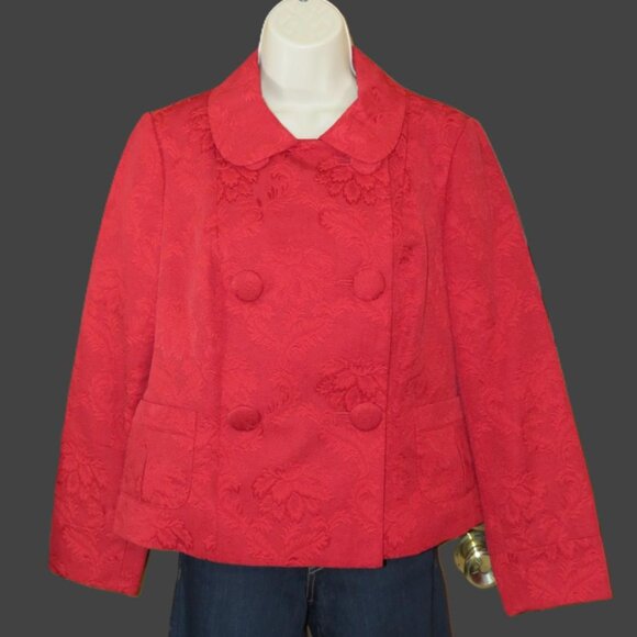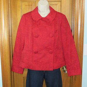 Beautiful red jacket from Talbots. The jacket is double breasted with a rounded collar. There are 2 front pockets accented with an inverted pleat. The jacket is lined with a beautiful printed lining.