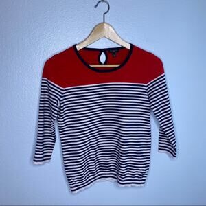 Talbots Petite Small light weight sweater. Super cute and comfy. Red block coloring at top w white and navy stripes rest of way down. Has a thicker hem and arm hem.
