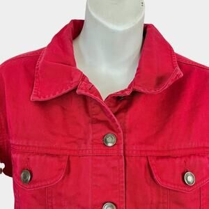 This Talbots Red Button Down Shacket is a stylish and versatile jacket suitable for travel or casual wear. Made from 100% cotton, this thick shirt jacket features a solid red color with button closure and long sleeves, making it perfect for winter, fall, or spring seasons. The jacket has a collared design and a short length, offering a classic and comfortable fit in size S. With its simple yet chic style, this Talbots jacket is a must-have addition to any woman's wardrobe.