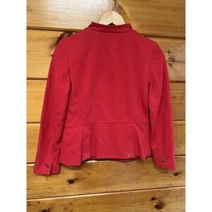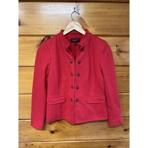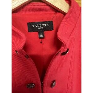 This Talbots jacket boasts a military-style design with crest buttons and a twill fabric. The red color and solid pattern make it a versatile piece for any occasion, whether it's a party, business meeting, or casual outing. The jacket has a classic fit and a short length, making it suitable for petites.
