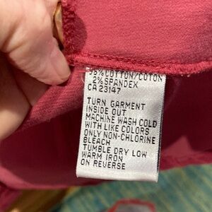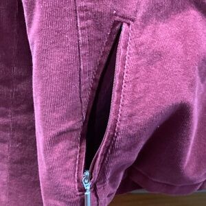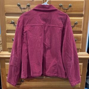 Stylish corduroy jean jacket by Talbots with stretch. Features button front and chest pockets. Zip side pockets. Color is actually more like a light cranberry. Slight wear on right front chest pocket. Under arm to under arm is 24” across.