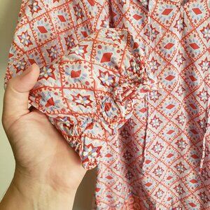 Pretty peasant blouse with geometric patterns in red with blue accents and a border print at hem. By Talbots