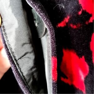 This stunning Talbots velvet-feel jacket in a 16WP (Petite Plus) is a bold and romantic statement piece. Black with vivid red roses, it offers a soft gothic, witchy vibe perfect for dark academia, romantic vintage, or holiday styling. Classic button front, subtle A-line silhouette, side slit pockets, fully lined interior, and 3/4 sleeves. Made of 100% cotton shell with polyester lining. Excellent preowned condition with no flaws noted. A rare find for your vintage-inspired wardrobe.