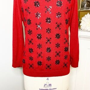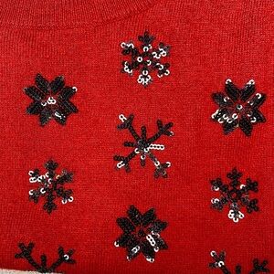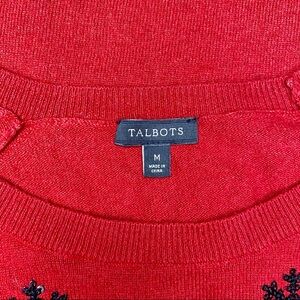 Talbots Red Snowflake Crewneck Sweater. Lambswool blend, this is super soft. Black sequin snowflakes on the front. 3/4 Sleeves. Like new. Size medium.