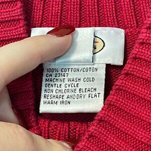 Cozy and festive Talbots 100% cotton sweater in a rich red hue with white embroidered snowflakes down the front. Features a ribbed mock neck, cuffs, and hem for a classic winter look. Perfect for the holidays or cozy winter days.