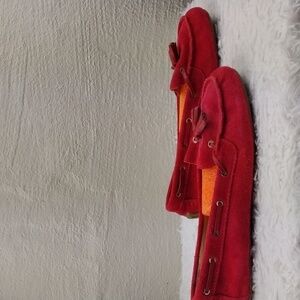 Talbots Women's Red Suede Leather Tassel Upper Round Toe Slip On Flat Moccasin Loafer Style Shoe. Rubber Sole. Light Cushion Footbed. Light Upper Toe Wear. Size 9 Like New Condition. Color May Vary Due To Lighting.