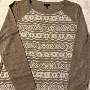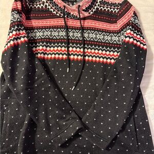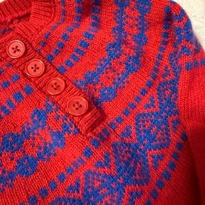 Chic red sweater with intricate blue design. Features button detail on shoulder. Ideal for layering.