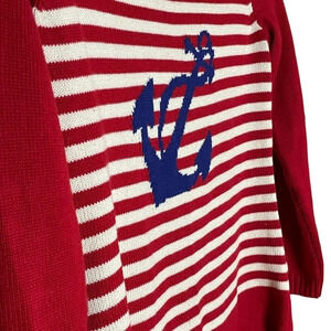 Hey there! I wanted to tell you about this lovely Talbots Petite Nautical Sweater I have available. It's a classic knit sweater in a vibrant red color with some stylish white stripes. The best part is the large navy anchor design across the chest, adding a really cool nautical touch.