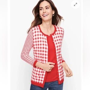 This button-front, 3/4 Sleeves Talbots Red White Gingham Cardigan Sweater is perfect for adding pop of classic charm to your wardrobe