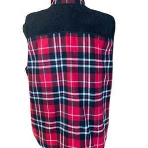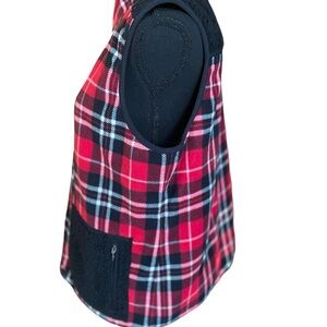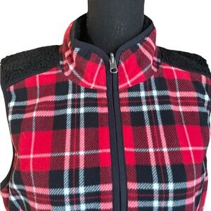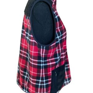 Stylish plaid vest with a zip front. Features red and black check pattern. Soft and comfortable material. Perfect for layering.