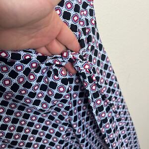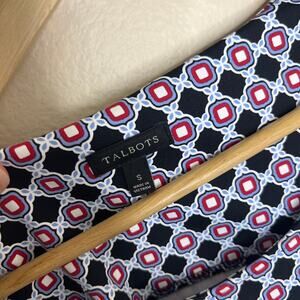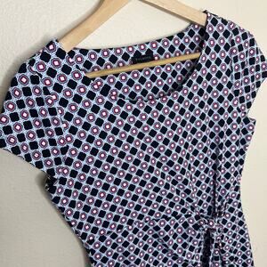 Talbots Red and Blue Ruched jersey Sheath Dress Small. Preowned and in excellent condition. Side ruching and with fixed tie across front. Slimming look, light weight and great for summer. Please see all photos. Approx measurements in pictures.