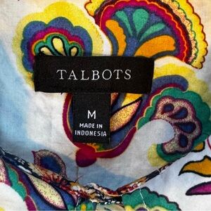 This Talbots button-down shirt features a lively floral pattern in striking red and green hues. The long-sleeved design is perfect for adding a pop of color to your wardrobe, with its eye-catching mix of flowers and butterflies. Ideal for making a statement, this top is both stylish and versatile.