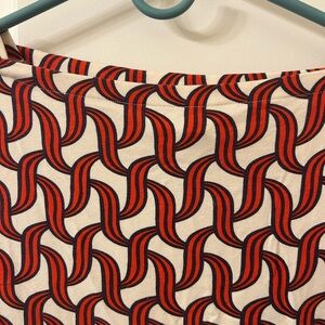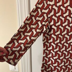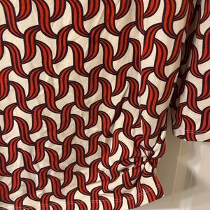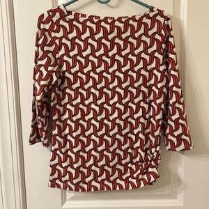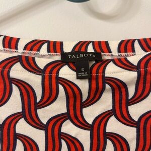 This eye-catching Talbots blouse showcases a bold red and white graphic pattern, offering a fitted silhouette that flatters the figure. The blouse features three-quarter length sleeves and a soft, stretchy fabric, making it a comfortable yet stylish choice for any occasion.