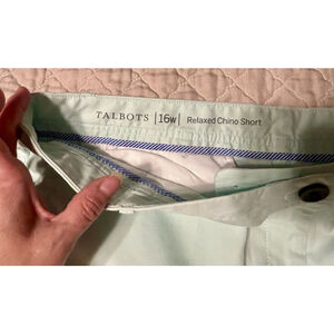 These are pre-owned Talbots Relaxed Chino Shorts, size 16W, in a light mint green color. They feature a button and zipper closure, belt loops, and front and back pockets. See photos for measurements. Smoke free home